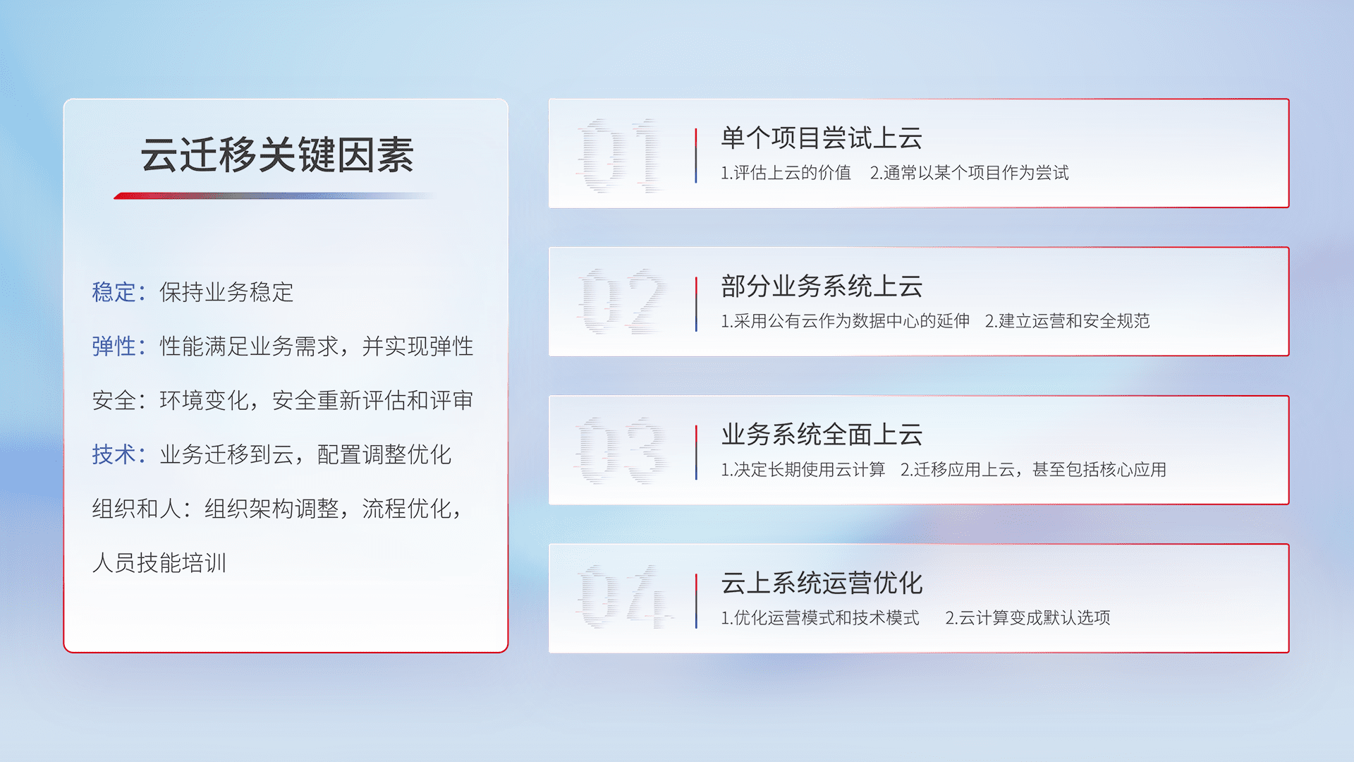 结合实际业务,,,从规划设计、、云平台选型、、云原生改造、、数据迁移、、、集成交付,,,迁移全过程为客户识别最佳上云路径,,,,做好风险识别管理,,,,设计网络架构、、、、身份权限、、、、安全审计合规、、操作审计、、、日志审计、、、监控告警策略、、多站点容灾设计等,,,,对云上基础设施进行整体规划,,,,提升IT治理水平,,以满足弹性、、高可用、、高性能的需求。。