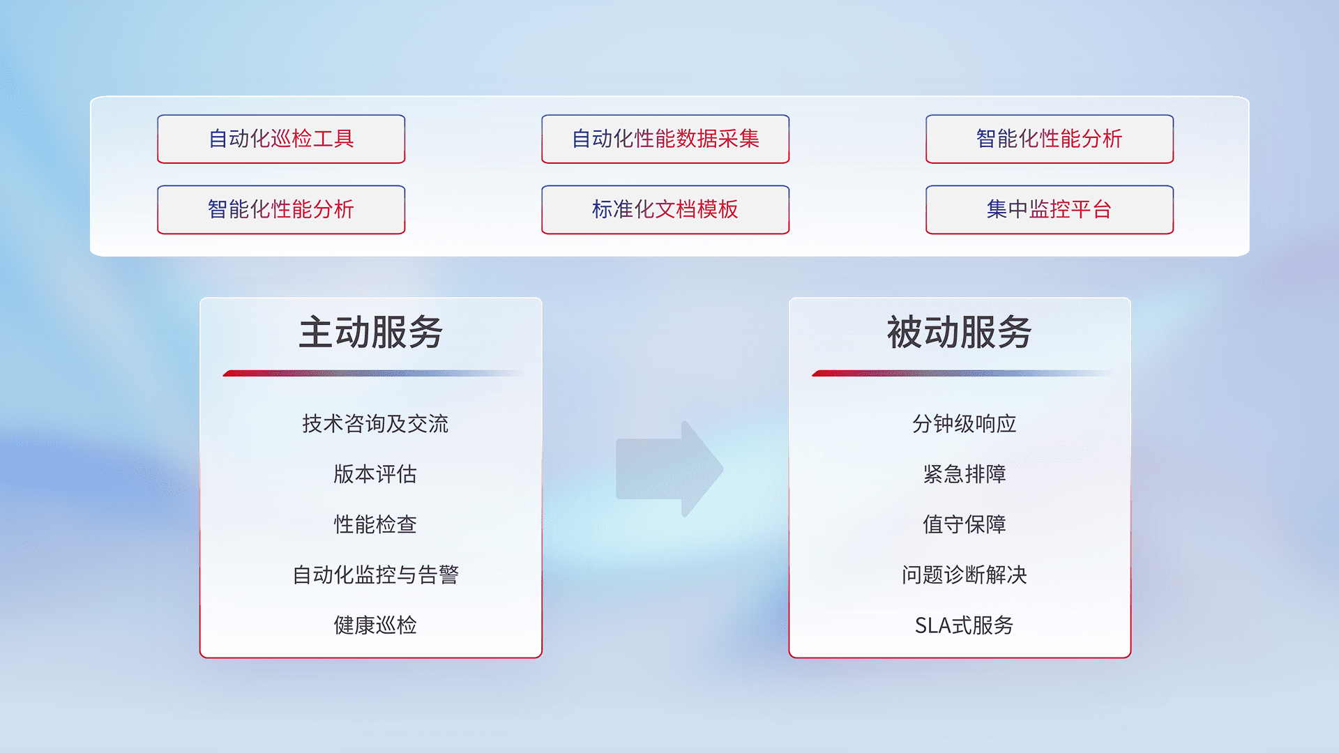 智能化工具和标准化文档,,,保障服务质量,,,,提供主动服务(包含技术咨询、、版本评估、、、性能检查、、自动化监控与告警、、健康巡检)和被动服务包含(分钟级响应、、、、紧急排障、、、值守保障、、、、问题诊断解决、、SLA服务)。。。